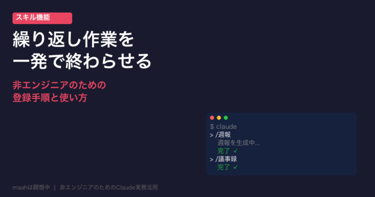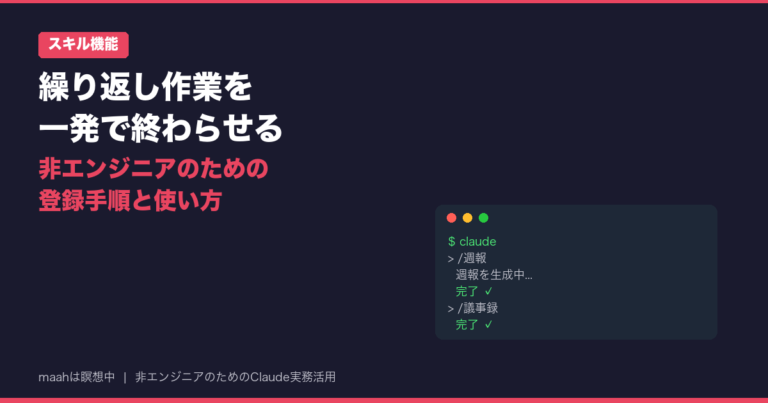 Claude無料版のスキル機能を使えば、週報・議事録・メール返信など繰り返し作業をスラッシュコマンド一発で完了できます。設定手順と実務で使える登録例5選を紹介。