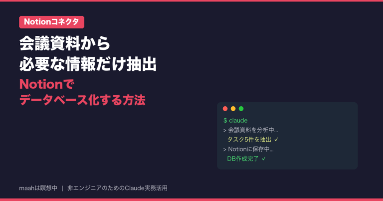 Claude無料版×Notionコネクタ|会議資料から必要な情報だけ抽出してデータベース化する方法 会議資料を読み返すたびに、「あの報告事項の期限、どこに書いてあったっけ?」と探し回っていませんか。 ...