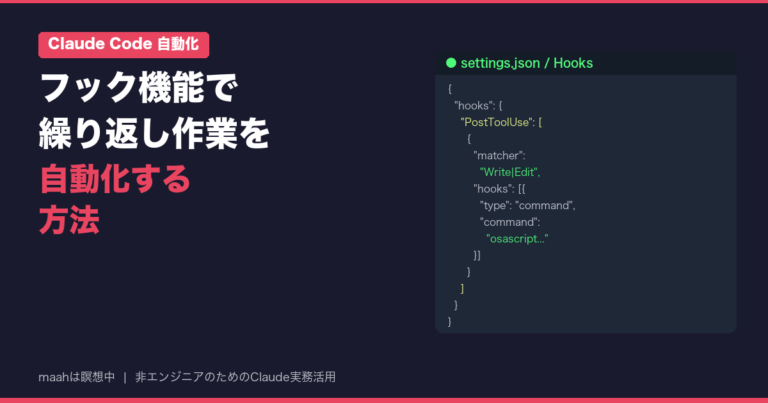 Claude Codeのフック機能を使えば、ファイル編集後の通知やログ記録を自動化できます。非エンジニアでもコピペで設定できる3つのHooks設定を紹介します。