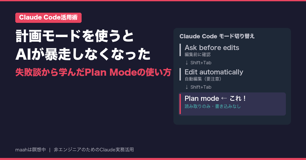 この記事では、私が実際にやらかした失敗談を交えながら、計画モードの使い方と、使い始めてから暴走がゼロになった理由を正直に書きます。