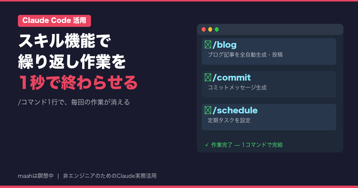 - Claude Codeのスキル機能は「よく使う指示をコマンド化する仕組み」